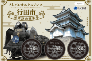 秩父鉄道は、SLパレオエクスプレスの運転区間を初めて延長し、8月30日に行田市駅発の「SL日本遺産のまち行田号」を特別運行する。 「SL日本遺産のまち行田号」の運行を記念し、記念乗車券・入場券・オリジナルグッズを発売する…