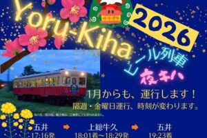 小湊鐵道は、12月まで発売をしている『夜キハ』について、好評につき2026年1月から3月発も『夜キハ』2026ツアーとして運行することを発表した。 「キハ200」の車内を特別仕様に変更し、おつまみ弁当+生ビール、ハイボー…