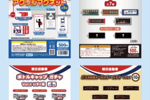 東武商事は、オリジナルカプセルトイ4商品を発売する。 オリジナルカプセルトイは、「東武鉄道車内ステッカーアクリルマグネット」「東武鉄道方向幕キーチェーン」、「朝日自動車 ボトルキャップガチャVol.1いすゞ編」「朝日自動…