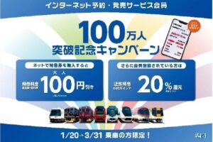 近畿日本鉄道は、「インターネット予約・発売サービス」会員100万人突破記念キャンペーンを1月20日から実施する。 キャンペーンは、期間中に近鉄特急チケットレスサービスを利用して特急列車に乗車すると、通常の特急料金からおと…