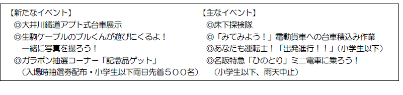 《主なイベント内容》床下探検隊、あなたも車掌!「扉よし!!」(インターネット抽選)、鉄道グッズ販売