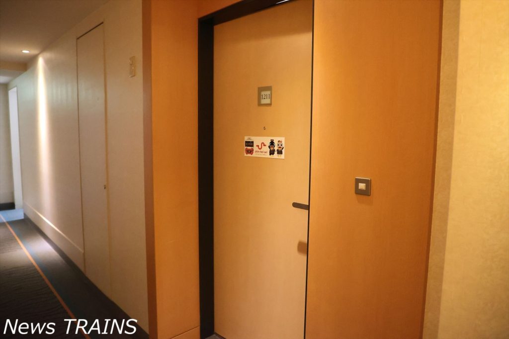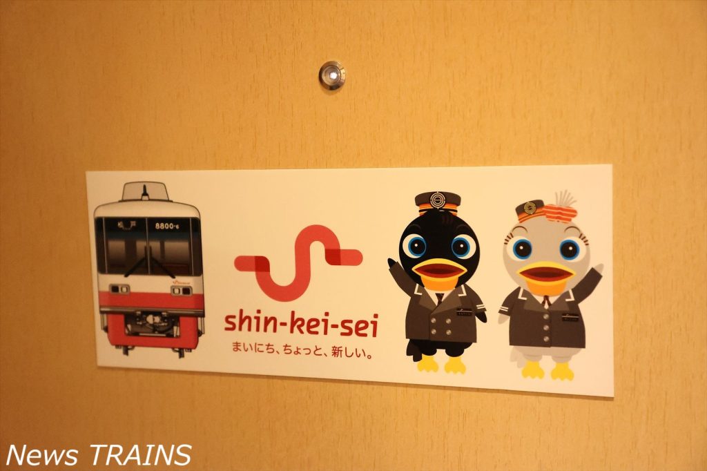 今回のトレインルームは、京成ホテルミラマーレの12階に位置しており、部屋に入室する前の扉には「shin-kei-sei」と「しんちゃん」「けいちゃん」をデザインしたプレートが掲出され、入室する前からワクワク感を楽しめる。
