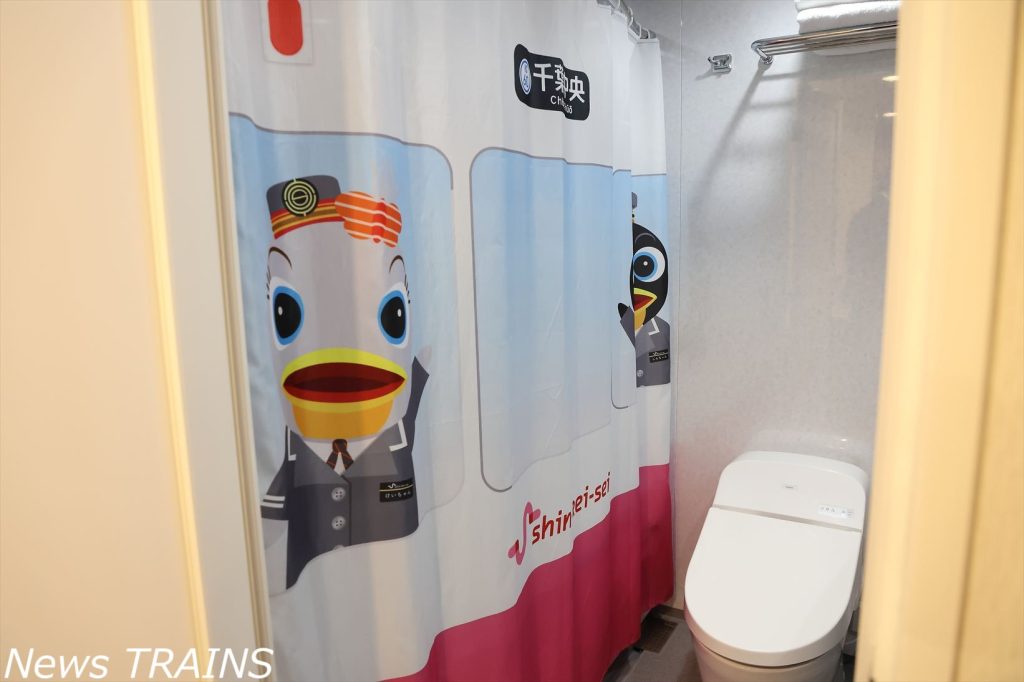そのほか、8800形をイメージしたクッションやベッドスローにバスルームにも新京成電鉄のシャワーカーテンが設置された。
