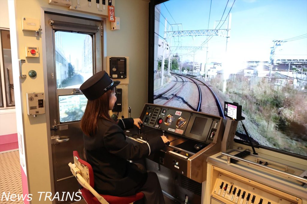 室内には、こだわり満載のシミュレーターが設置された。100インチの大画面に、乗務員室前面の映像を再現。運転士が参考にする「乗務員室扉からの景色」もシミュレーターに連動するなど、実際の車両さながらにシミュレーターを楽しむことが可能だ。運転士&車掌ボイスには、鉄道タレントの響丈さん、豊岡真澄さんによるものを収録。運転士または車掌、どちらかで響丈さん、豊岡真澄さんのボイスを選択することできる。シミュレーターでは、路線の方面の選択や「全線走行」と3つの区間のいずれかの選択、運転モードは「新人」「ベテラン」「マスター」のいずれか選択して楽しむことができるように設定されている。
