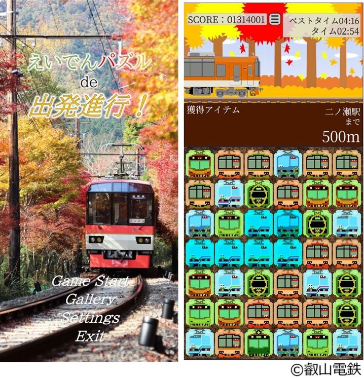 2025.04.21 Other News TRAINS編集部 【叡山電鉄】スマホ向けアプリゲーム「えいでんパズルde出発進行!」をAndroid向けにリリース 叡山電鉄は、2025年9月27日に開業100周年を迎えることを記念し、記念企画の一環としてスマホ向けアプリゲーム「えいでんパズルde出発進行!」をリリースした。 叡山電鉄の社員が企画、デザイン、プログラムを行ったという。ゲームは無料でプレイが可能で、Android端末のみに対応、Google Playにて配信中。 【画像:叡山電鉄 公式X】