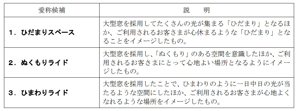 投票は、「認知度向上を図り、多くのお客さまに親しみを持っていただくため」としており、3つの候補「ひだまりスペース」「ぬくもりライド」「ひまわりライド」の中から2000系「大型フリースペース(仮称)」の愛称としてふさわしいと思うものを1つ投票、最も投票数の多かった愛称に決定する。