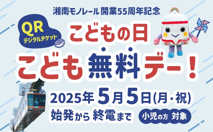 湘南モノレールは、1970年3月7日に開業、2025年3月7日開業から55周年を迎えた。開業55周年を記念し、5月5日に小学生を対象に行うもので、湘南モノレール公式チケットサイトにおいてQRデジタルチケット版小人用1日フリー配布する。