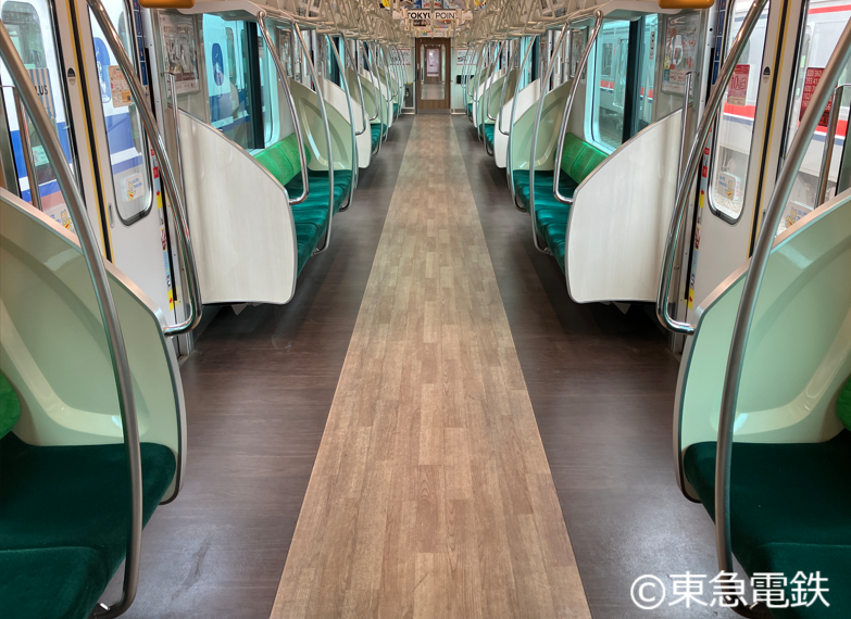 車内のインテリアデザインは、壁・床・座席を一新。東急線沿線の風景をイメージした落ち着きのある色合いとすることで、親しみやすさと心地良さを感じられるデザインとし、車内にはすべての乗客が利用しやすいようにフリースペースを増設する。