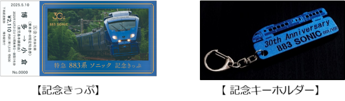 「883系ソニック30周年記念きっぷ」は、記念きっぷと記念台紙のセットを900セット、JR九州エンジニアリングで作られた記念キーホルダー(現在運行している883系ソニックの先頭車両前面と同じ素材、同じ塗料を用いて制作)がセットになったのを100セット限定で発売する。