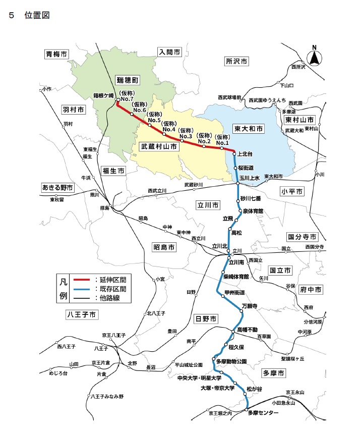 特許を受けた延伸区間は、既存開業終点駅のある上北台駅(東大和市)から武蔵村山市を経由し、JR箱根ケ崎駅のある西多摩郡瑞穂町に至る延長約7.0kmで終点を含め7つの駅を新設する計画。
