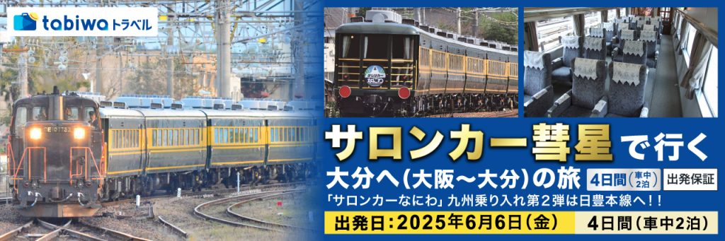 6月6日に運行する「サロンカー彗星」は、大阪駅を出発し東海道線、山陽本線、鹿児島本線、日豊本線を経由し大分へ。ツアーは車中2泊となるため、3日目の夜には大分駅を出発し日豊本線、鹿児島本線、山陽本線、東海道本線経由し、4日目に大阪駅へ到着する行程となる。ツアーでは、下関駅で機関車の交換を見学することも可能だ。参加には事前申込が必要となる。