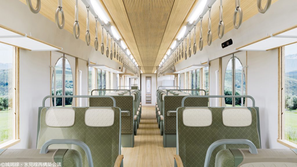 また、内装には明るい車内空間に天井や床に木目を活用し、温かみを演出。座席は、沿線の車窓から望める豊かな緑を基調としたものとし、車内外の一体感を創出する。さらに、窓の一部に丸窓を取り入れ、「利用者が沿線の魅力、路線への愛着、ワクワク感を感じられるデザイン」とした。