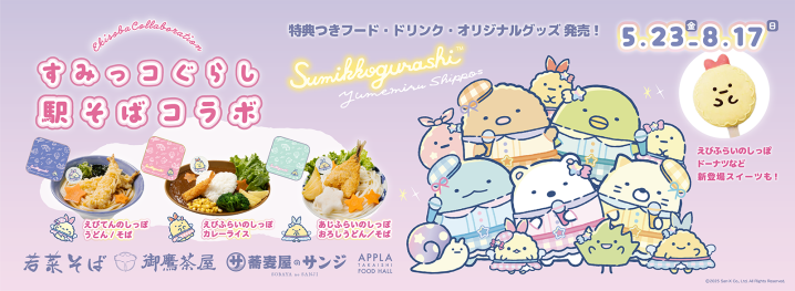 阪急電鉄沿線と南海電鉄沿線に「若菜そば」「蕎麦屋のサンジ」等を展開する飲食チェーン、平野屋は、駅そば全14店舗で「すみっコぐらし」とのコラボフェアを5月23日から開催している。