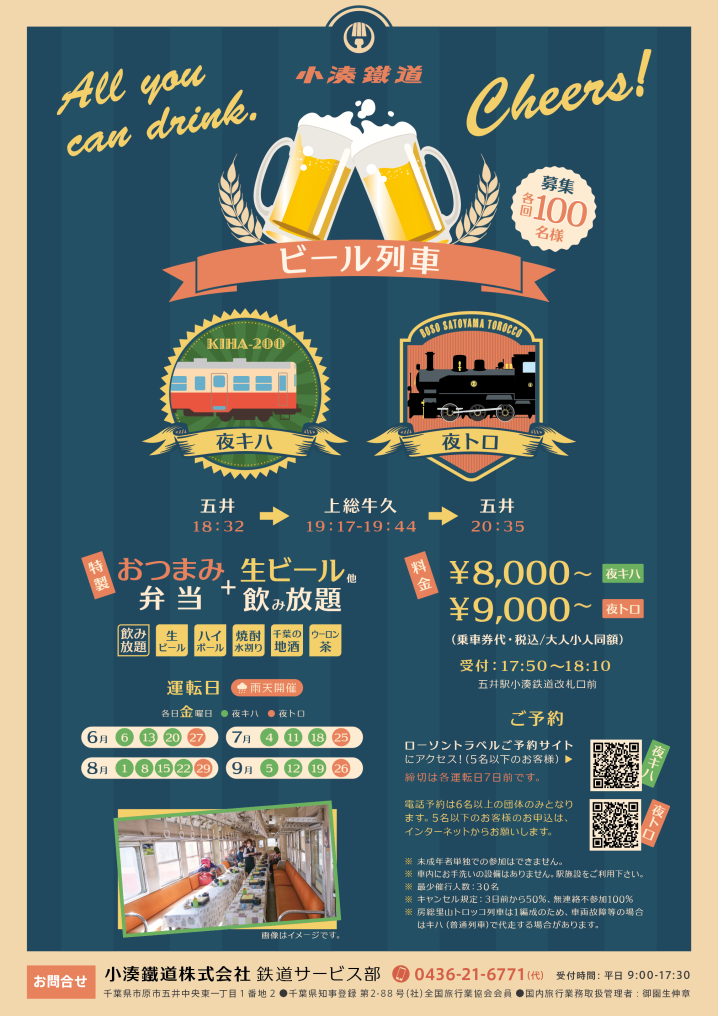 観光列車「房総里山トロッコ」をビール列車として運行するもので、今年は「キハ200」が初登場。「房総里山トロッコ」または「キハ200」おつまみ弁当+生ビール、ハイボール、焼酎水割り、千葉県の地酒、ウーロン茶 飲み放題付きで楽しむことが可能だ。