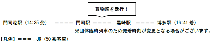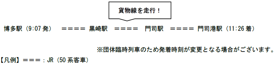 九州旅客鉄道(JR九州)は、JR九州オリジナルツアー「貨物線を走行!50系客車で博多~門司港乗車旅」と「貨物線を走行!50系客車で門司港~博多乗車旅」の発売を開始した。