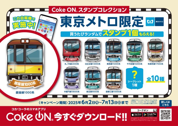 キャンペーンは、東京メトロの各駅に設置されているキャンペーン告知ポスターが掲出されたコカ・コーラ社Coke ONⓇ対応自販機で、「Coke ONⓇ」アプリを使用し、コカ・コーラ社製品を購入すると、通常のスタンプに加え東京メトロ限定デザインのオリジナルCoke ONスタンプ(9種+シークレット1種)を1個ランダムに付与。