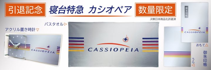 グッズは、引退記念のアクリル置き時計、バスタオル、御朱印帳など「寝台特急カシオペア」引退を記念した商品をラインナップ。数量限定での販売となる。
