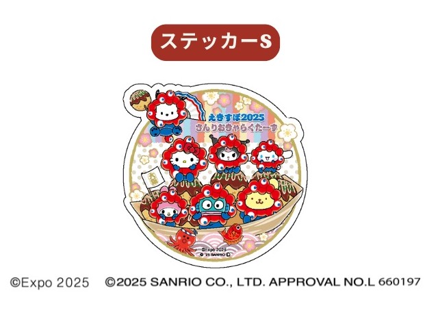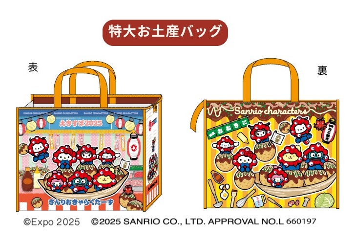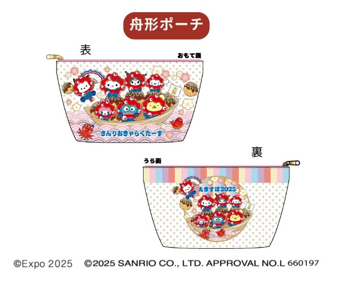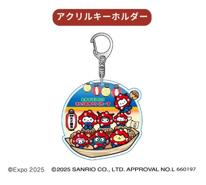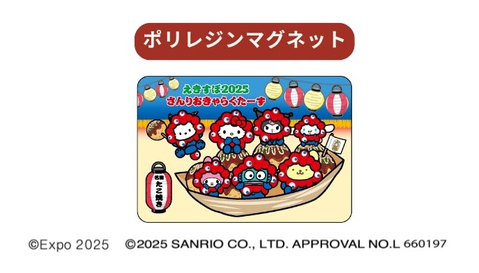 ハローキティ、マイメロディ、シナモロール、クロミ、ポムポムプリン、ポチャッコ、ハンギョドンが公式キャラクター「ミャクミャク」になりきった姿がとってもキュート♪大阪名物・たこ焼きの舟に、みんなが大集合!限定店舗での販売となる。