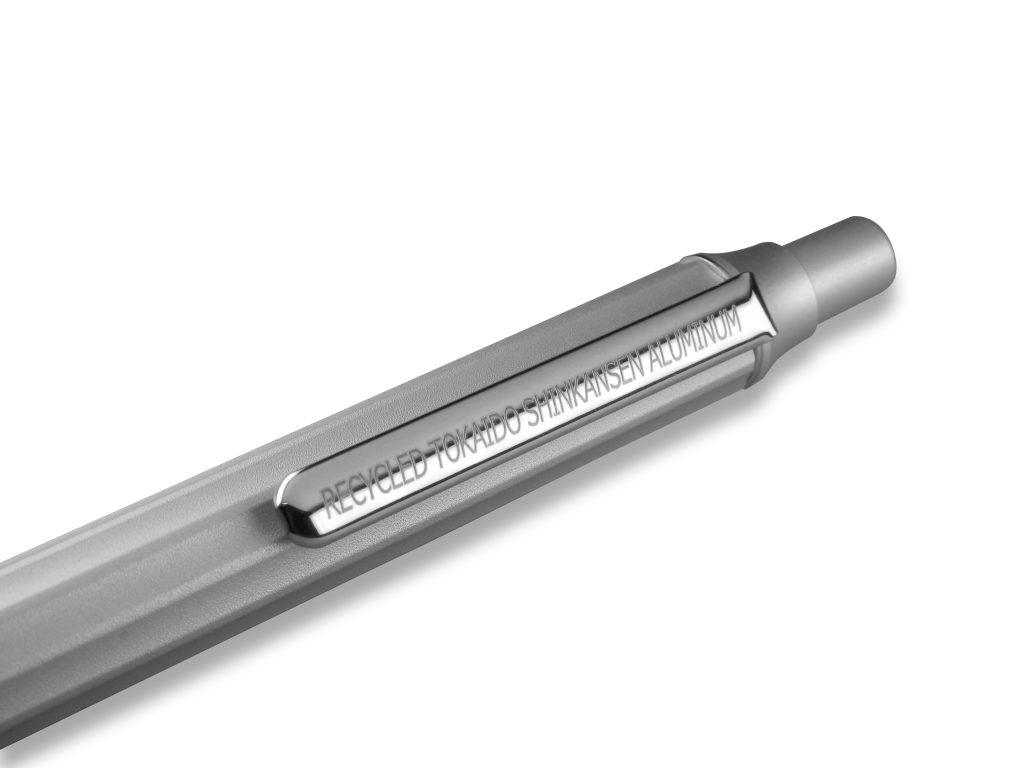「東海道新幹線 再生アルミボールペン」は2021年頃まで東海道新幹線を走行したN700typeA「X2」編成の再生アルミを使用し制作。光沢のあるシルバーを基調とし、スリットの入ったスタイリッシュなデザインが特長で、ノックボタンに東海道新幹線再生アルミのロゴをデザインした。