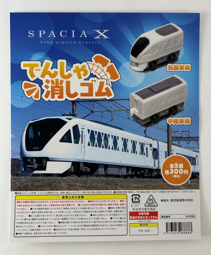 2025.06.25 グッズ News TRAINS編集部 東武鉄道から、カプセルトイを利用したスペーシアXのオリジナルグッズが新発売!主要駅で販売中 東武鉄道は、『スペーシアXでんしゃ消しゴム』をカプセルトイを利用したオリジナルグッズとして6月25日から販売を開始した。 『スペーシアXでんしゃ消しゴム』は、先頭車両と中間車両の全2種があり、たくさん集めて長い編成を作って楽しむことも♪ 販売価格は、各300円。東武鉄道主要駅にて販売中 【画像:東武鉄道沿線情報 -スカイツリーラインエリア 公式X】