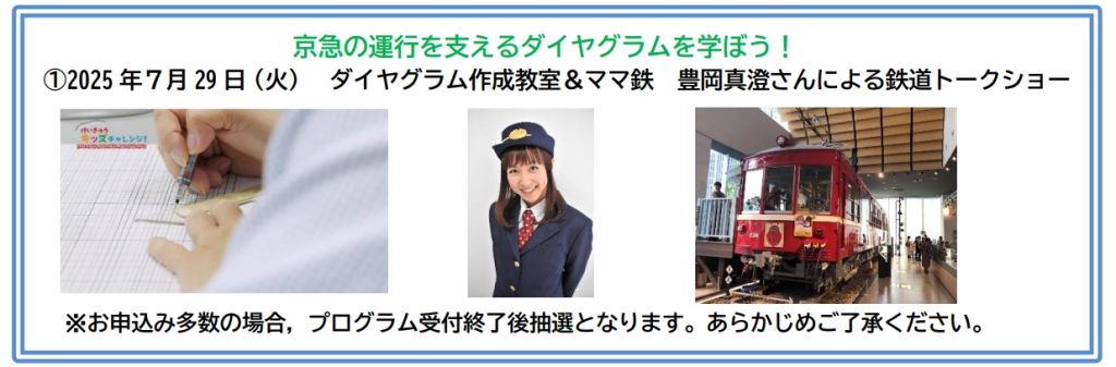 《行 程》京急ミュージアム 集合 9:00==ダイヤグラム作成体験教室 9:20~(90分程度)==ママ鉄 豊岡真澄さんによる鉄道トークショー 11:00~(30分程)==京急ミュージアム見学 11:40~(230形乗務員室見学) ※有料コンテンツの体験は不可==修了式 12:40~==現地にて解散 13:20 ※京急ミュージアムは 14:00まで見学可