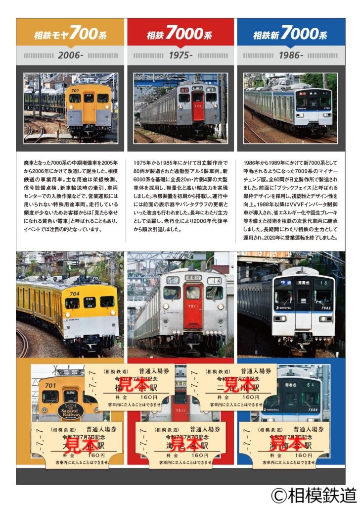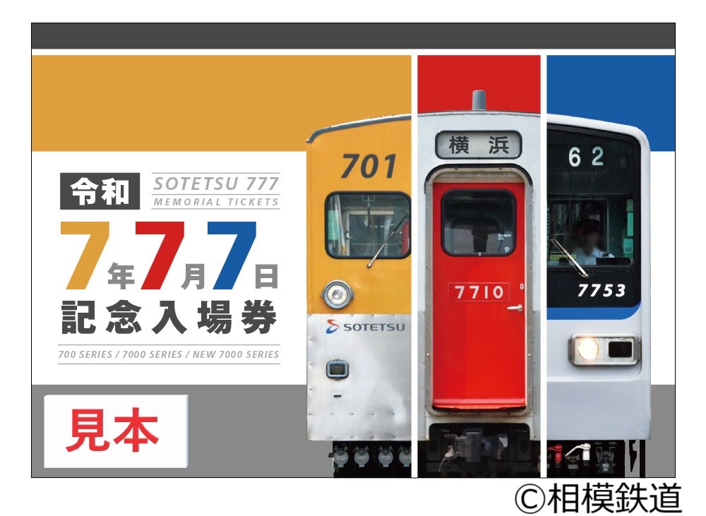 「令和7年7月7日記念入場券」は、令和7年7月7日が「7並び」になることを記念し、表紙や中面には、「幸せの黄色い電車」とも言われている事業用車両モヤ「700系」、昭和・平成・令和を駆け抜け、2020年に引退したアルミ車両「7000系」、7000系の前面デザインなどを一新した車両「新7000系の「7」にちなんだ3つの車両を紹介。裏面には車両それぞれの側面図を掲載デザインした。7月1日から通信販売と「SOTETSU GOODS STORE」二俣川で先行販売をおこなうほか、相鉄線7駅では7月7日から発売する。