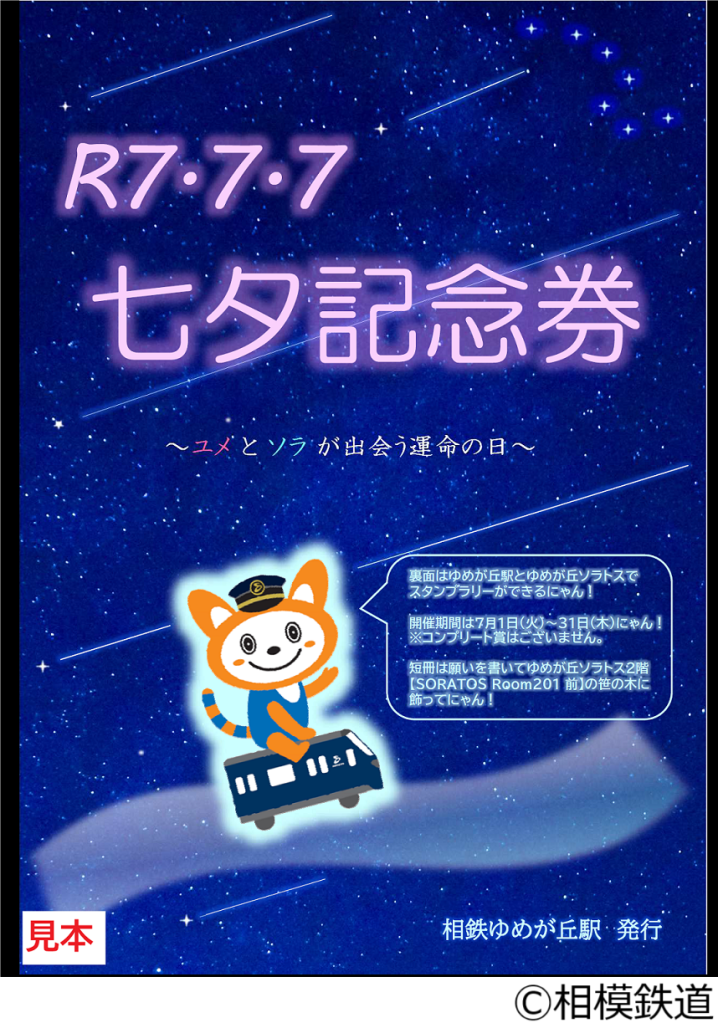 「令和7年7月7日七夕記念券セット」は、相鉄いずみ野線 ゆめが丘駅と同駅前の「ゆめが丘ソラトス」と共同で実施する「七夕企画」(7/1~7/31)の一環として限定販売するもの。表面は、天の川を走る相鉄線に乗った「そうにゃん」をデザイン。券面は、ゆめが丘駅とゆめが丘ソラトスにちなんだ「ユメの記念券」と「ソラの記念券」の2種類をセット。七夕にちなみ、購入特典として「七夕を楽しむそうにゃん」と「新型車両13000系」の2種類の短冊をプレゼントする。また、短冊はゆめが丘ソラトス階「SORATOS Room201前」に設置した笹に願いごとを書いて飾ることが可能となっている。