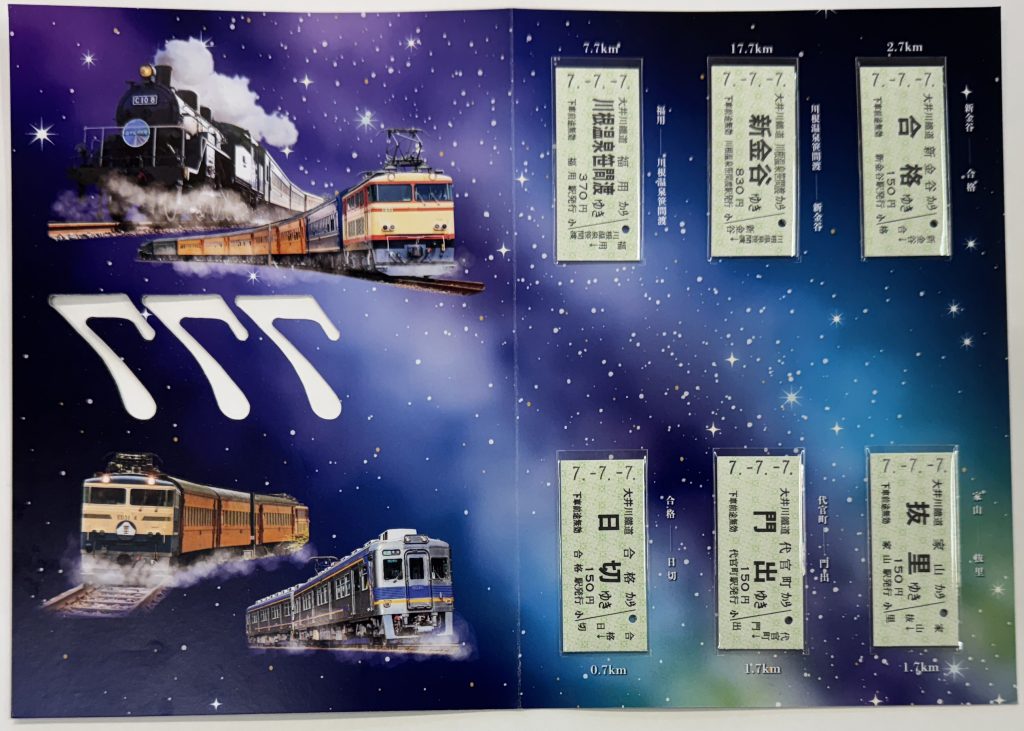 《特 徴》台紙は闇夜を走り抜ける大鉄の列車のデザイン。7月7日は七夕でもあることから、数多の星が煌めく天の川を大井川本線の列車たちが結ぶ。表紙の「777」の部分は切り抜き加工。切り抜き箇所から、中面の銀河が見える、奥行き感ある仕上げとなっている