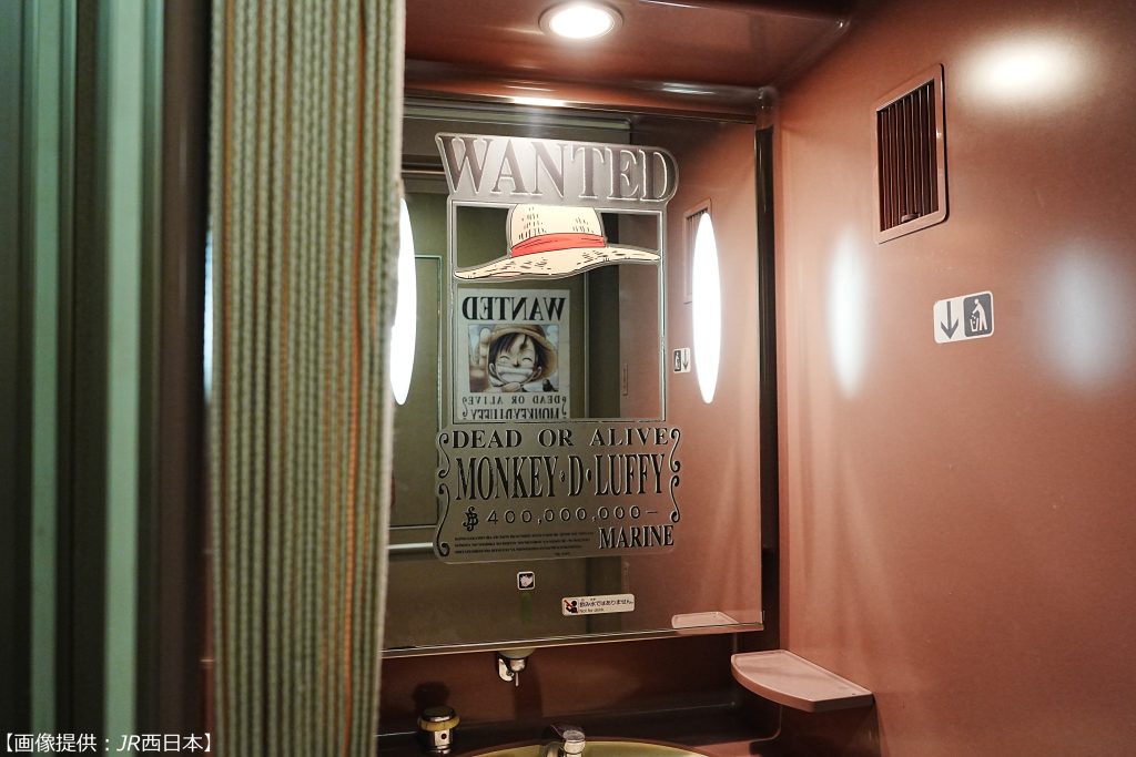 座席はすべてのヘッドカバーが「チョッパー」をイメージしたオリジナルヘッドカバーに、客室ドアや乗降ドアにも装飾を施し、一部の洗面台では鏡を手配書のデザインとすることで「利用者自身が手配されている雰囲気を楽しめる」ようにした。