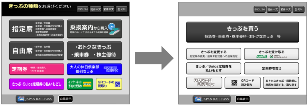 また、従来の指定席券売機についても、新型機と同様にメニュー画面を新型機同様のシンプルなものに変更する。新型機同様、改札外設置の券売機が対象となり、10月1日に実施するとしている。