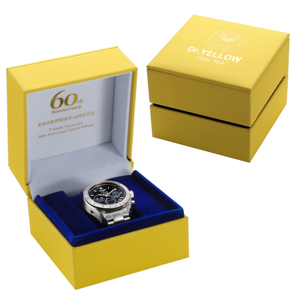 蓋の表面には「Dr.YELLOW Class 923」の名前を銀箔押しでスタイリッシュにで刻印した時計専用ボックスに、ボックスの内側には東海道新幹線開業60周年記念の文字が金箔押しで美しく輝き、特別感を演出した。また、特製ギャランティカード付きで、923形ドクターイエローT4編成のフルカラーフォトを使用、その姿を美しく印刷し、記念モデルにふさわしい仕上がりとなった。