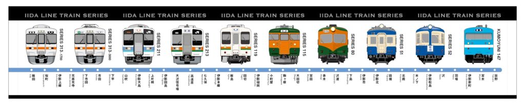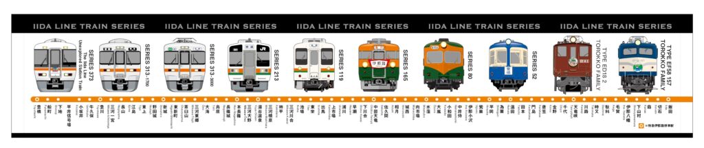 373系(飯田線秘境駅号)、313系1700番台、313系3000番台、213系、211系、119系、115系、165系、80系、51系、52系、クモユニ147、ED18 2(トロッコファミリー号)、EF58 157(トロッコファミリー号)