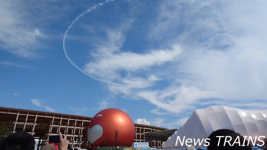 航空自衛隊のアクロバット飛行チーム「ブルーインパルス」が、12日大阪・関西万博会場の上空で展示飛行を行った。