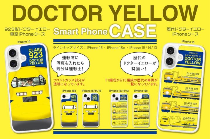 ランナップでは、東海旅客鉄道(JR東海)所有のT4編成が2025年1月に惜しまれつつも引退、6月からリニア・鉄道館での展示が始まった923形ドクターイエローの正面デザインをあしらった。アイコニックな”顔”を大胆に配置し、シンプルながら圧倒的な存在感を放つデザインに、運転台の窓の部分に写真を入れることで、運転士気分を味わうことも。さらに、歴代4種類のドクターイエローをイラストで表現したスマホケースも登場。それぞれの時代に新幹線の「健康診断」を担ってきた名車たちの姿を、1枚のデザインの中に凝縮した。JR東海リテイリング・プラス 公式オンラインショップのほか、鉄道グッズ専門店「BLUE BULLET」で7月14日から発売する。