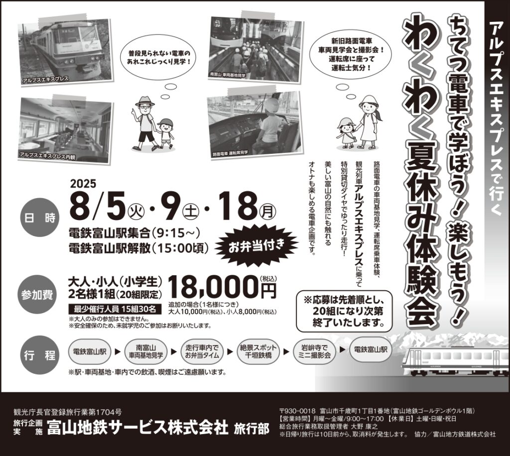 富山地方鉄道は、『アルプスエキスプレスで行く「わくわく夏休み体験会」』を8月に開催する。