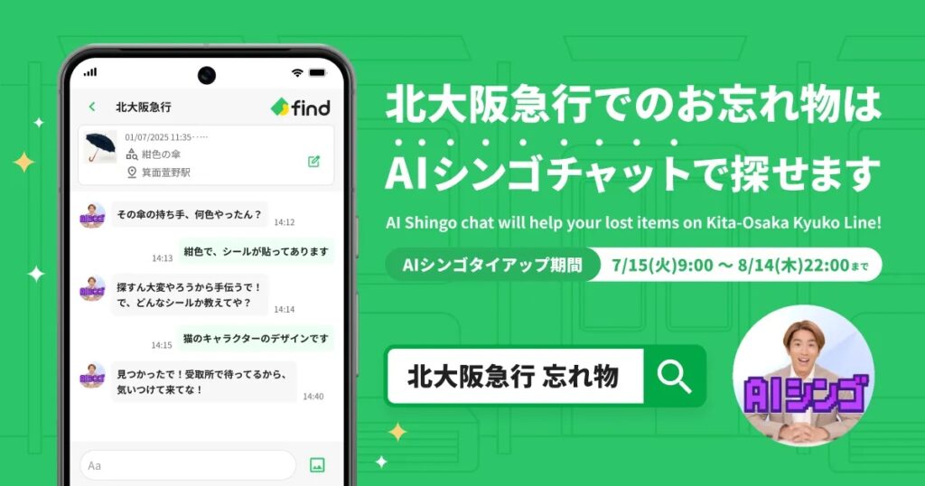 ●村上信五がモデルの「AIシンゴ」が北大阪急行の“落とし物対応”に登場!?落とし物クラウドfind、北大阪急行で“AIシンゴ”とタイアップ
