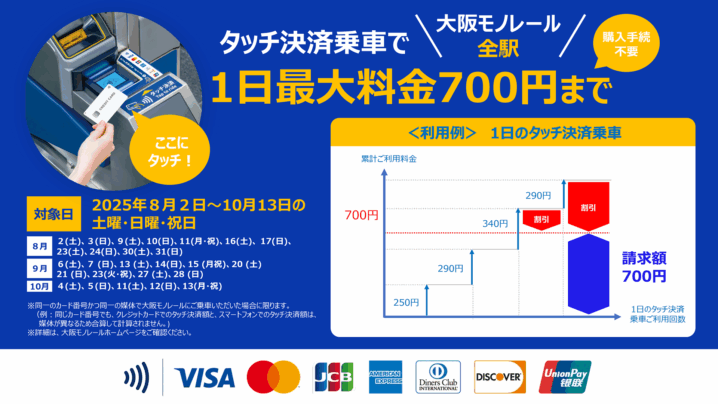 対象日に、タッチ決済で何回乗車しても請求額が1日あたり最大700円。もちろん、途中で他社線を挟んでも、大阪モノレール利用額の1日累計が700円を超えた場合も割引が適用となる。ただし、同一のカード番号かつ同一の媒体で乗車した場合に限るから注意が必要だ(※同一カードの利用でも、カード媒体での決済額とスマートフォンでの決済額は別扱いとなり、合算されない※)。