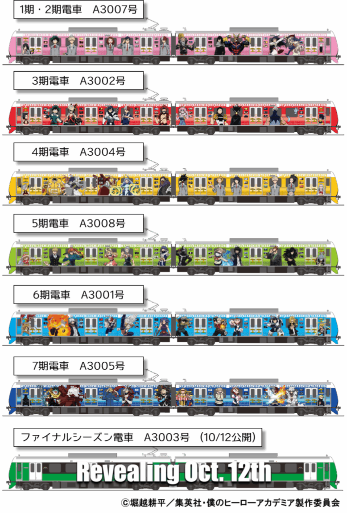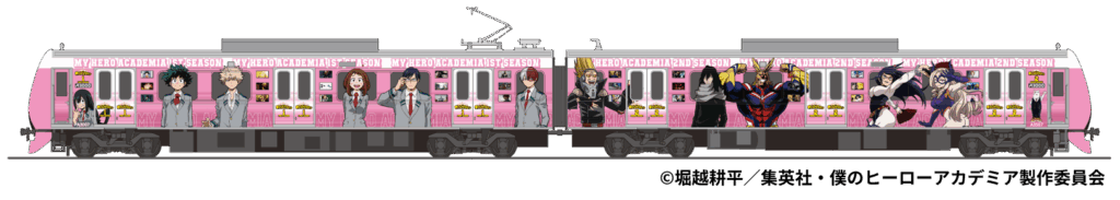 静岡鉄道がヒロアカと2024年3月に開催したコラボに続く第二弾となる企画は、10月4日からのTVアニメファイナルシーズンの放送に合わせ、9月21日~12月20日の開催を予定。コラボのために制作された描き下ろしビジュアルの展開、キャラクターをラッピングした電車やバスの運行な様々な展開を行っていく。