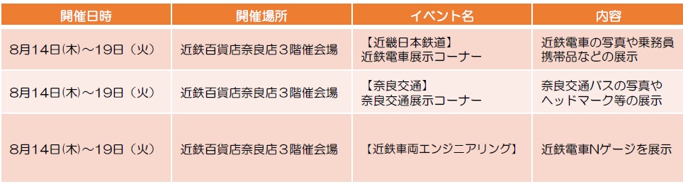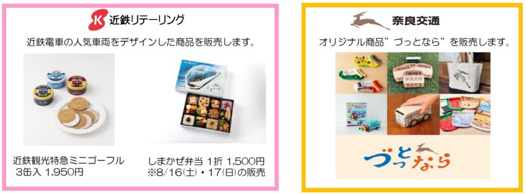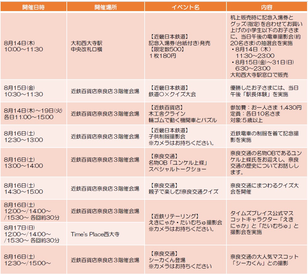 イベントは、近鉄グループ各社に関する食品やグッズの販売、近鉄電車の乗務員が携帯している物品展示、奈良交通バスの写真やヘッドマークなど希少品の展示を行うほか、トークショーや特典付きクイズ大会を実施する。さらに各社のオリジナルマスコットキャラクター(近鉄「あをによし」、近鉄リテーリング(Time’s Place) 「えきにゃか」「たいむちゅ」、奈良交通「シーカくん」)との撮影会など盛りだくさんの内容をお届けする。