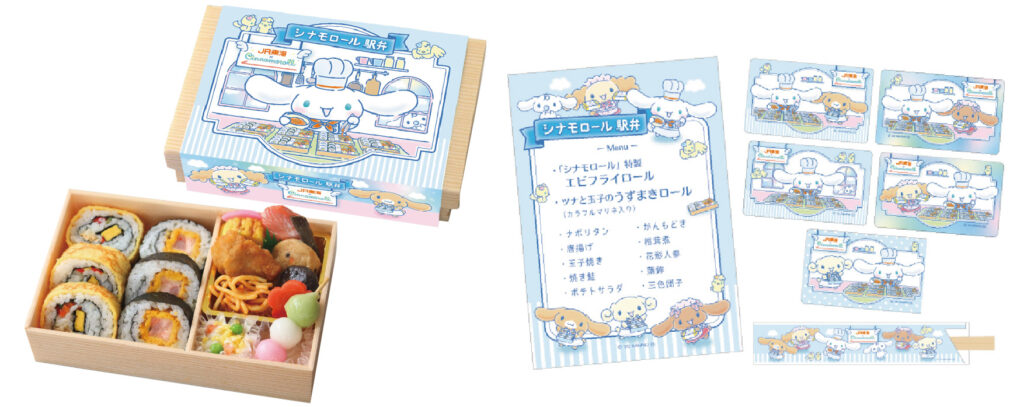 《内 容》シナモロールとおともだちがお手伝いする「駅のカフェ」のメニューを詰め合わせたコラボ駅弁がフェア期間限定で登場。シナモロールのしっぽをイメージしたロール寿司やナポリタン、唐揚げなどを詰め合わせた。また、パッケージ・箸袋・お品書きにもシナモロールとおともだちが登場、シナモロールづくしの駅弁となっている。ノベルティとして限定デザインのクリアカードをランダムで1枚封入