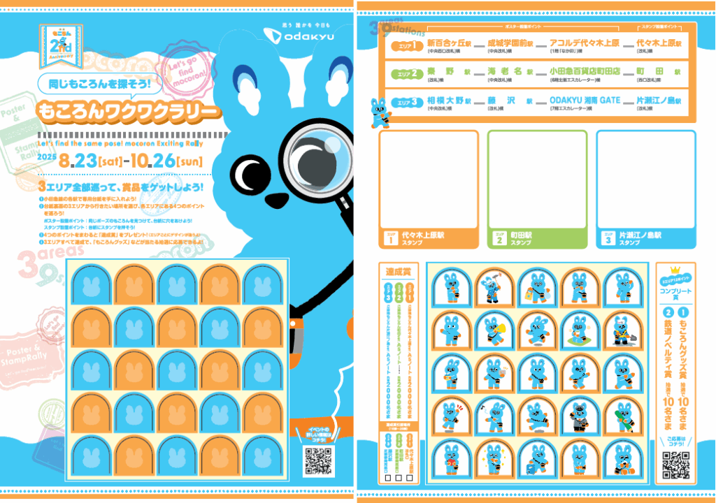 小田急線全駅のラックで専用台紙を取得 ⇒ラリーポイント(3エリア)を巡り、ビンゴゲームの要領で台紙に穴を開けたり、スタンプを押したりしてチェック⇒エリアごとの4ヵ所を達成すると、先着で達成賞をプレゼント⇒ 全12ヵ所達成すると、コンプリート賞が当たる抽選に参加可能