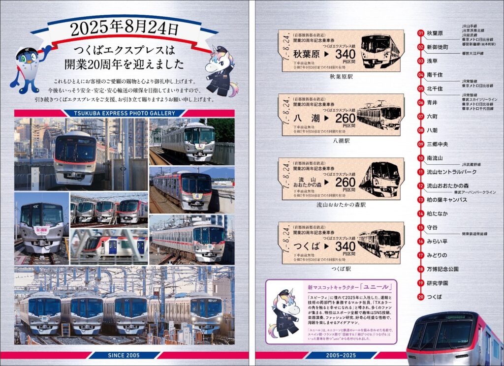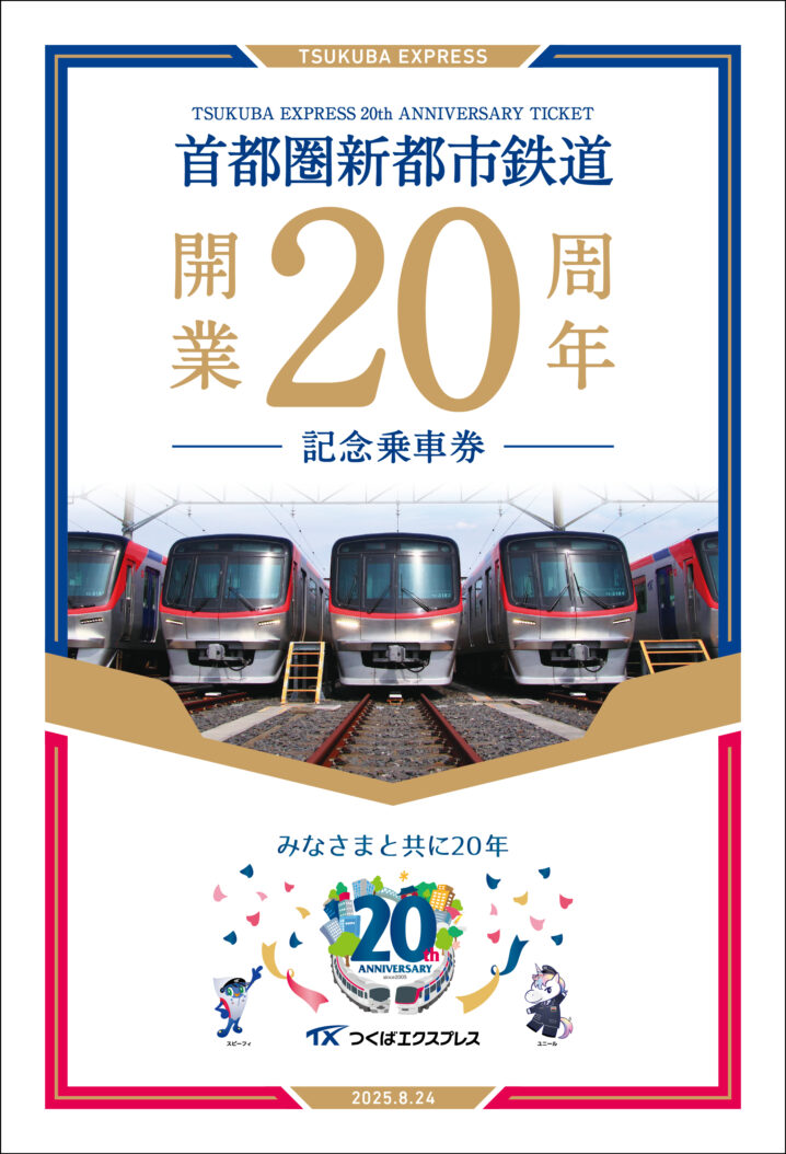 「開業20周年記念乗車券」は、秋葉原・八潮・流山おおたかの森・つくばからのD型硬券乗車券4枚を専用台紙に封入、専用台紙には開業から20年間の歴史を振り返る年表や、過去の周年ヘッドマーク車両の写真などをデザインした。2,000セットの限定発売となる。