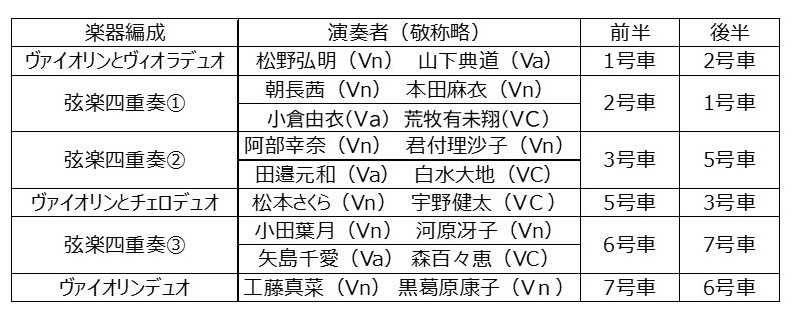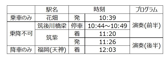 9月27日・28日に開催される音楽イベント「MUSIC CITY TENJIN 2025」のプレイベントとして運行するもの。当日は、九州交響楽団のメンバーとYamaちゃんこと元九州交響楽団ヴィオラ奏者山下典道氏が 6つの号車に分かれ、弦楽四重奏、ヴァイオリンデュオの演奏を行う。