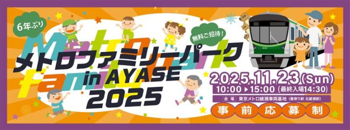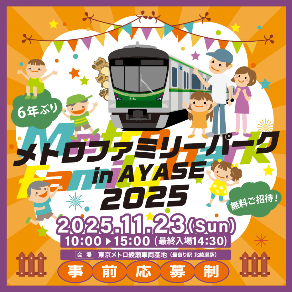 東京地下鉄(東京メトロ)は、東京メトロ綾瀬車両基地において、車両基地イベント「メトロファミリーパーク in AYASE2025」を11月23日に開催することを発表した。