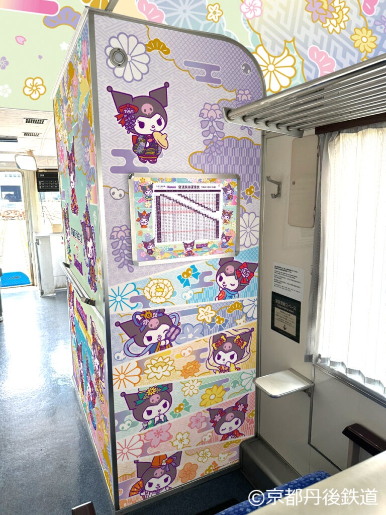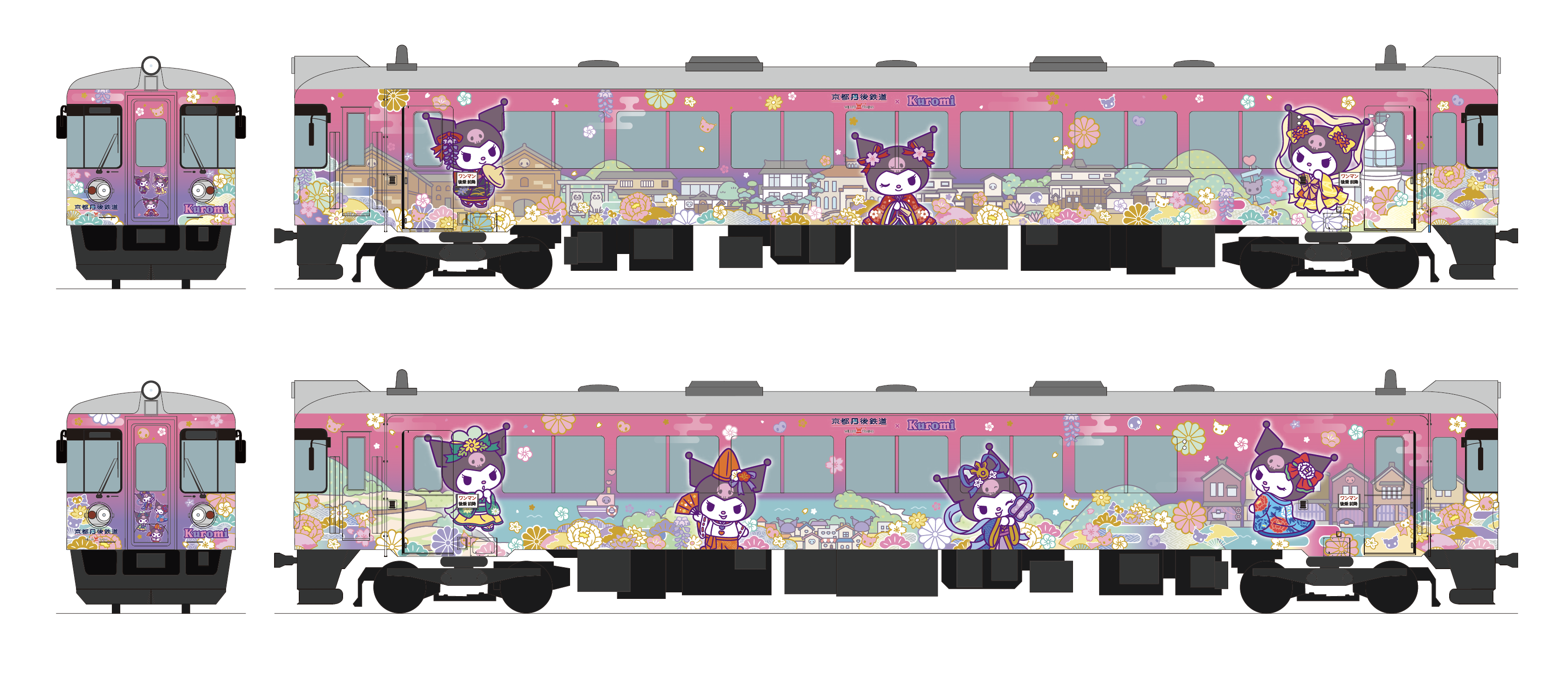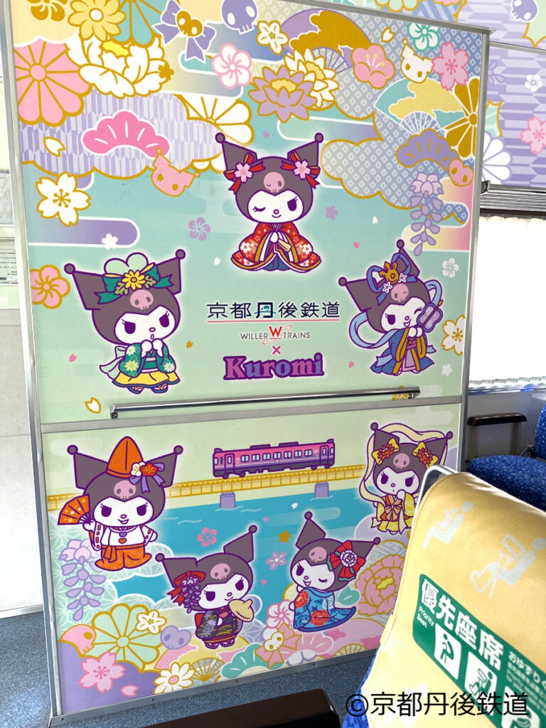 コラボ期間中は、丹鉄沿線の天橋立~峰山エリアを中心に伝承される「丹後七姫」をイメージし、装いを変えた「クロミ」がデザインされた特別ラッピング列車『クロミの丹後七姫トレイン』を運行する。