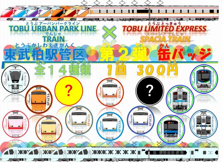 2025.09.08 グッズ News TRAINS編集部 【東武鉄道】「東武柏駅管区 第2弾 缶バッチ」がトイカプセルで登場! 東武鉄道は、駅係員が作成した「東武柏駅管区 第2弾 缶バッチ」の販売を開始した。 東武アーバンパークラインで活躍する車両と特急「スペーシアX」に加え、過去のカラーリングを含む特急「スペーシア」を含む全14種類をラインナップ。第1弾のデザインをリメイクしたものとなる。 東武柏駅中央口改札券売機前において5時~22時頃まで、1回300円で販売中。 【画像:東武鉄道】