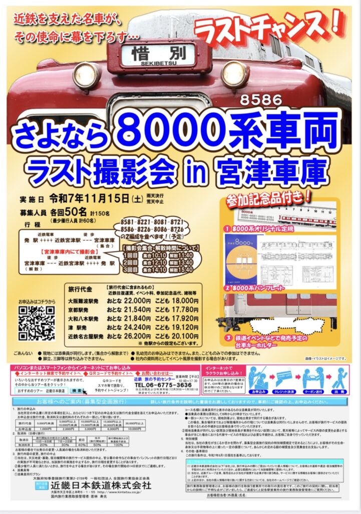 近畿日本鉄道は、「さよなら8000系車両 ラスト撮影会in宮津車庫」を11月15日に開催する。