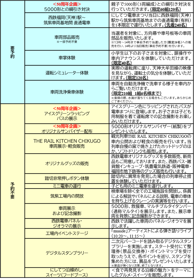 イベントは、日本で初めて鉄道が開業したことを記念して制定された「鉄道の日(10月14日)」にちなみ、日頃の感謝を込め実施しており、30回目の開催となる2025年は、西鉄電車5000 形がデビュー50 周年を迎えたことを記念し、同車両より採用している塗装色「アイスグリーン」カラーにちなんだ「西鉄電車アイスグリーン50周年企画」をイベントでも実施、取り組みの一環として、5000 形車両と親子による綱引き対決や、「アイスグリーン」カラーを施したラッピングバスの展示を行う。