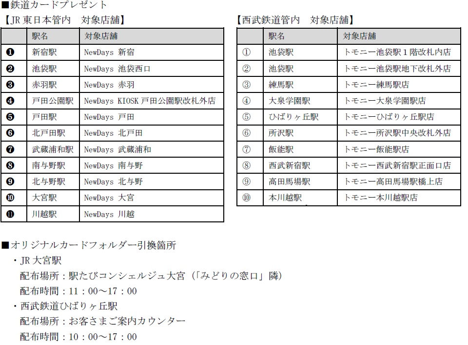 JR東日本は埼京線等の魅力あふれる鉄道車両の写真を楽しんでもらえるカード、西武鉄道は開業から現在までに活躍してきた新旧車両をデザインした。オリジナル鉄道カードは全21種類。対象店舗において、700円(税込)以上の購入者を対象にオリジナル鉄道カードを1枚プレゼントする。