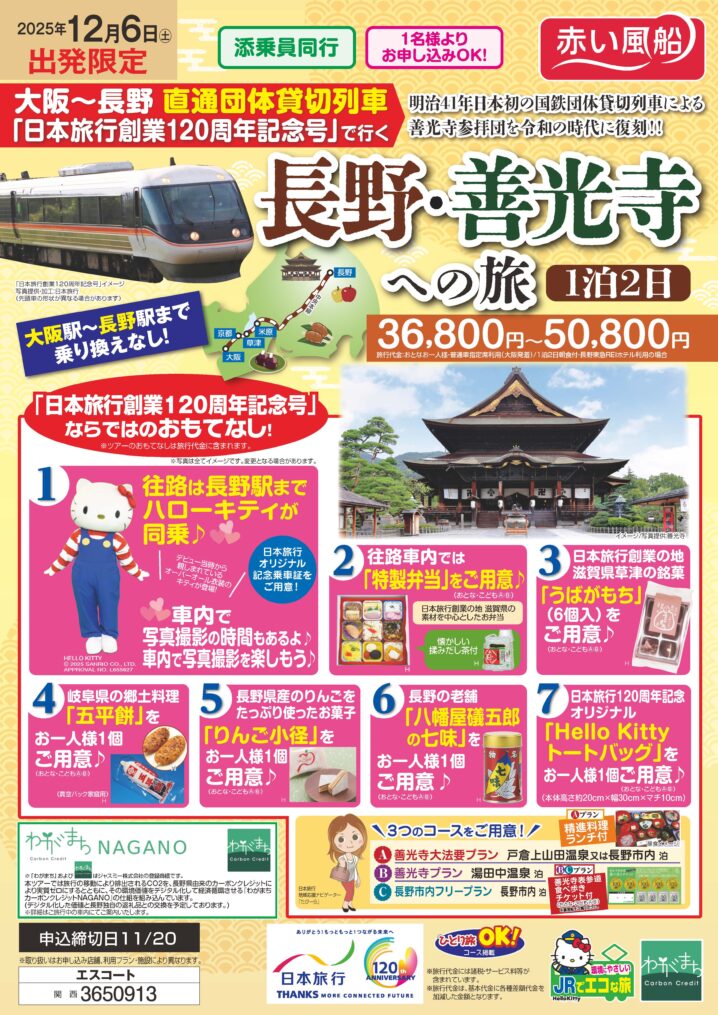 日本旅行は、『大阪~長野 直通団体貸切列車「日本旅行創業120周年記念号」で行く長野・善光寺への旅』の販売を開始した。